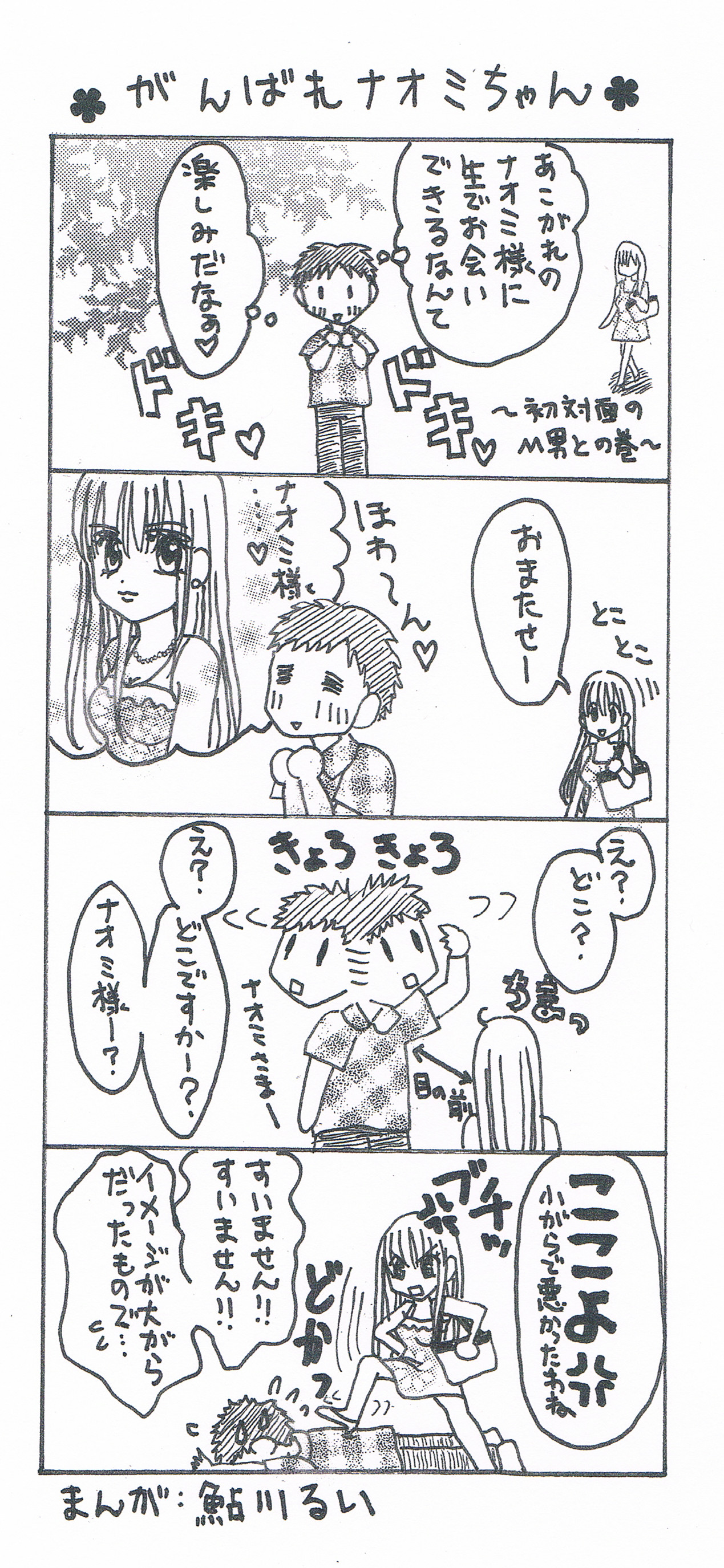 鮎川るい先生のファンです。先生の4コマ漫画はいつも楽しみにしています。先生の漫画が出た日は…1日がその漫画の事で、頭が一杯に成ります。いつか、先生が本屋さんの棚に並ぶ事を望みます。一番のファンのポッチーより。